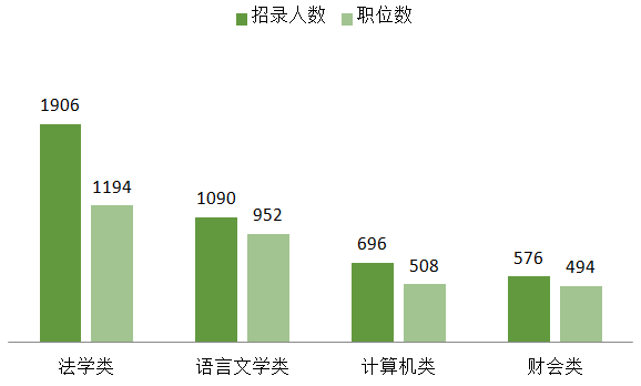 本次考試招錄中法學(xué)、語言文學(xué)類、計算機(jī)類和財會類四類專業(yè)需求量較大,其中法學(xué)類專業(yè)人氣最旺,提供1194個職位、招錄1906人,有法學(xué)類專業(yè)背景的考生選擇空間加大,要結(jié)合自身的學(xué)歷、資格證書等其他條件最終選出自己心儀的職位。