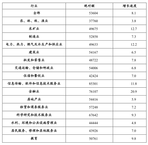 年平均工資最低的是農(nóng)、林、牧、漁業(yè)37760元,同比增長3.8%,