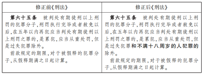 2011年5月1日起施行的《刑法修正案(八)》第六條對本條作了修改,增加了不滿十八周歲的人犯罪不構(gòu)成累犯的規(guī)定。