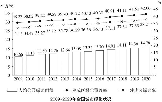 B.以2009年為基期計算,2009—2020年城市建成區(qū)綠地率年均上升0.4個百分點以上