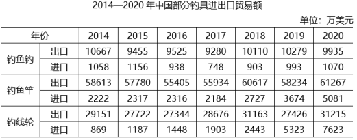 D.2014—2020年,釣魚鉤和釣魚華進口額景低的年份不同