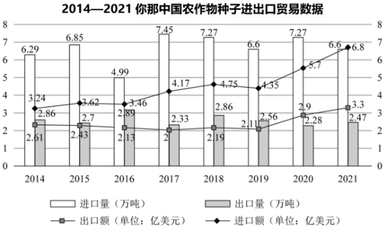 112.2014—2021年間,我國農(nóng)作物種子貿(mào)易進出口總量同比增長的年份有幾個:( )