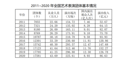 2020年末,全國共有藝術表演團體17581個,從業(yè)人員43.69萬人,其中各級文化和旅游部門所屬藝術表演團體2060個,從業(yè)人員10.75萬人。2020年,全國文化和旅游部門所屬藝術表演團體共組織政府采購公益演出13.38萬場,比上年下降14.9%;觀眾0.86億人次,下降27.9%。