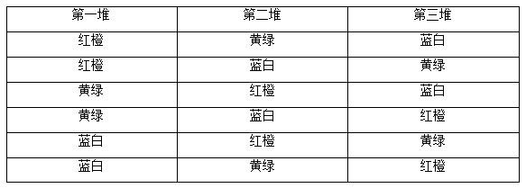 通過這個(gè)表格的簡單羅列,我們便可以清楚地發(fā)現(xiàn)這6種情況都是同一種分堆情況,即紅橙一堆,黃綠一堆,藍(lán)白一堆,算重復(fù)了6次,