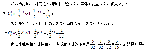 例1:植樹節(jié)期間,某單位購進一批樹苗,在林場工人的指導(dǎo)下組織員工植樹造林。假設(shè)樹苗的成活率為50%,那么,該單位職工小張種植5棵樹苗,至少成活4棵的概率是多少?( )