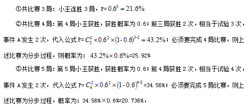例2:某次乒乓球比賽中采取五局三勝,小王和小張進行一場比賽,比賽中小王每一局比賽獲勝的概率均為0.6,則小王在這次比賽中最終獲勝的概率約是多少?( )