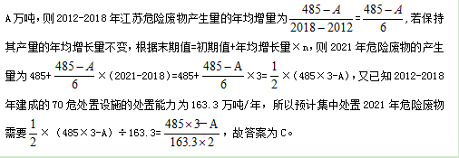 若江蘇危險(xiǎn)廢物產(chǎn)生量保持2012-2018年年均增量不變,那么以2012-2018年建成的70座危險(xiǎn)廢物集中處置設(shè)施的處置能力,預(yù)計(jì)集中處置2021年危險(xiǎn)廢物需多少年?(假設(shè)2012年江蘇危險(xiǎn)廢物產(chǎn)生量為A萬(wàn)噸)( )
