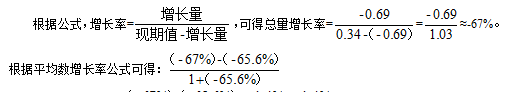 2.代入公式:由材料可知“2020年前三季度,B市鄉(xiāng)村旅游實(shí)現(xiàn)收入0.34億元,與上年同期相比減少0.69億元;接待游客與上年同期相比下降65.6%”。其中鄉(xiāng)村旅游實(shí)現(xiàn)收入為總量,總量增長(zhǎng)率未知,接待游客人次為份數(shù),份數(shù)增長(zhǎng)率為-65.6%。