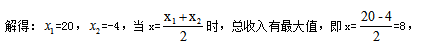 其函數(shù)圖像為一個(gè)拋物線。我們要求最大總利潤,即拋物線對(duì)稱軸的對(duì)應(yīng)點(diǎn)。此時(shí)令總利潤為0,可得拋物線與x軸上的兩個(gè)交點(diǎn),即10+x=0或400-20x=0,