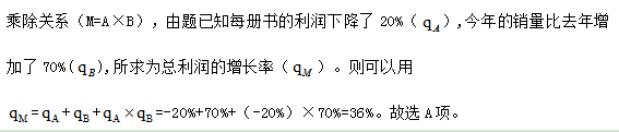 例2:有一本暢銷書,今年每?jī)?cè)書的成本比去年增加了10%,因此每?jī)?cè)書的利潤下降了20%,但是今年的銷量比去年增加了70%。則今年銷售該暢銷書的總利潤比去年增加了:( )。