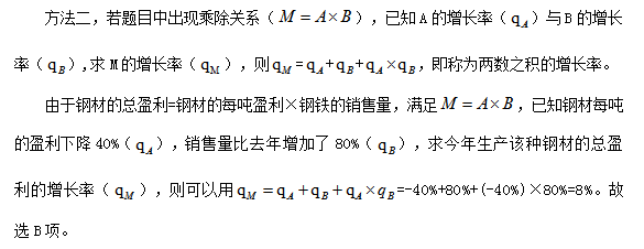 【答案】B【解析】方法一,分析題干,鋼材的總盈利=鋼材的每噸盈利×鋼鐵的銷售量。設(shè)去年的每噸盈利為x,銷量為y,可得總盈利為xy;則今年每噸盈利為x(1-40%)=0.6x,銷量為y(1+80%)=1.8y,可得總盈利為0.6x×1.8y=1.08xy。故今年生產(chǎn)該種鋼材的總盈利比去年增加了