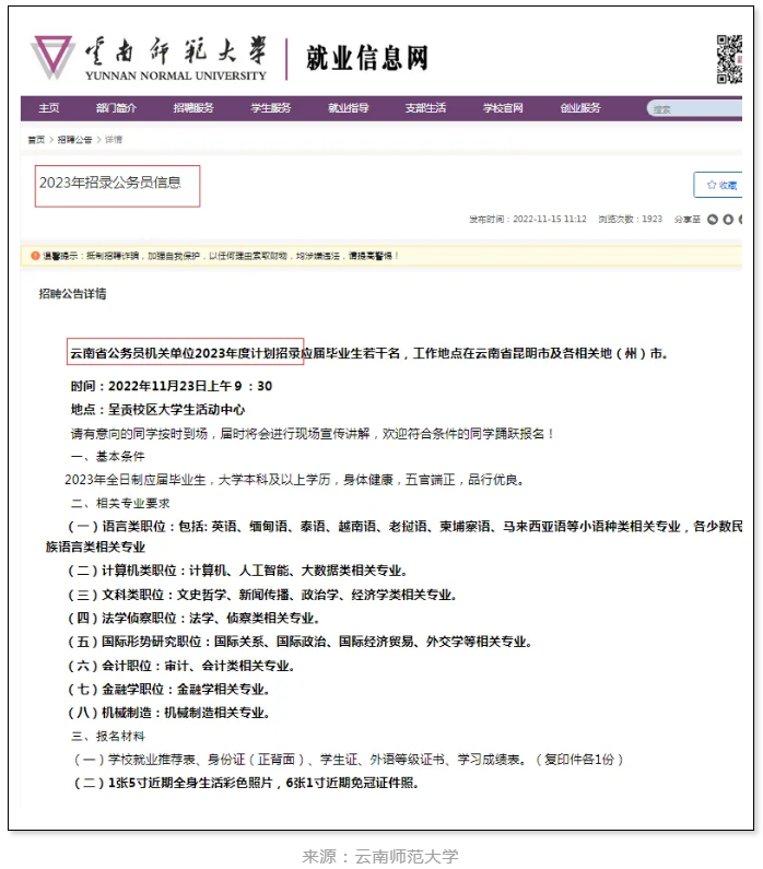 近日,云南師范大學(xué)發(fā)布2023省考宣講會(huì)消息:云南省公務(wù)員機(jī)關(guān)單位2023年度計(jì)劃招錄應(yīng)屆畢業(yè)生若干名,工作地點(diǎn)在云南省昆明市及各相關(guān)地(州)市。具體如下: