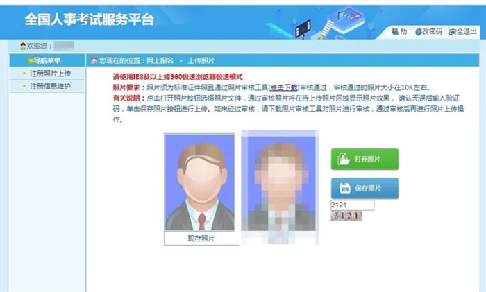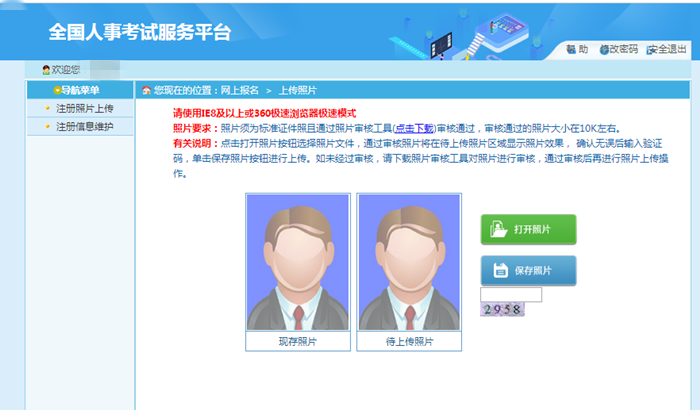 進入登錄界面,首次登錄系統(tǒng)需要上傳照片,系統(tǒng)只能上傳通過中國人事考試網(wǎng)發(fā)布的照片處理工具(http://download.people.com.cn/zhaopianshenhe.rar)處理后的照片,點擊“打開照片”按鈕選擇要上傳的照片,輸入驗證碼,點擊“保存照片”,上傳成功后跳轉(zhuǎn)到照片確認頁面,核對照片無誤后點擊“確定”。