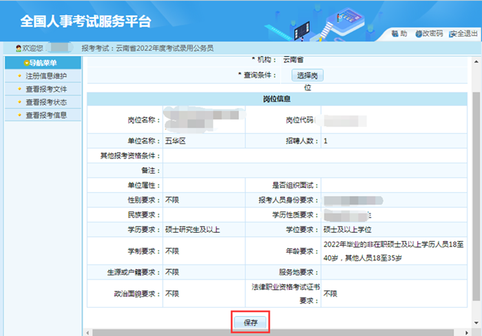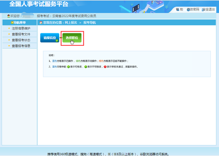 2.報考者應認真了解基本的政策和要求,仔細閱讀《招考簡章》,結(jié)合自身條件,慎重選擇適合自己的招考職位。職位提交前請確認個人信息是否按本人實際情況準確填寫,如個人信息填寫與本人實際情況不一致需要修改,點擊“查看報考狀態(tài)”“信息維護”按鈕進行修改。一旦進行“報名信息確認”操作后,將不能再修改報名信息和報考職位。