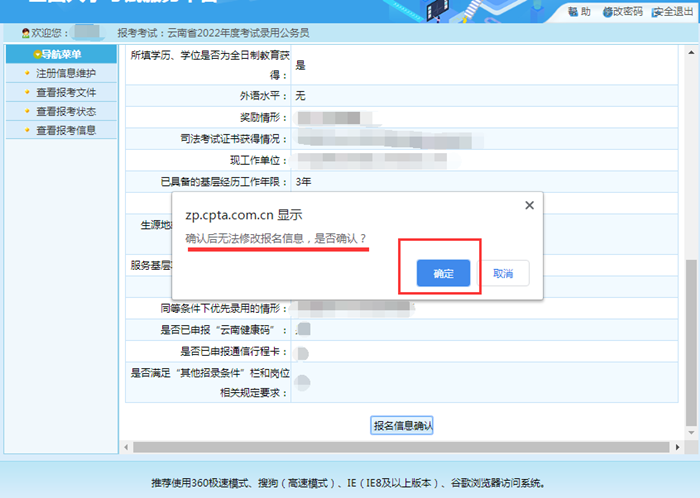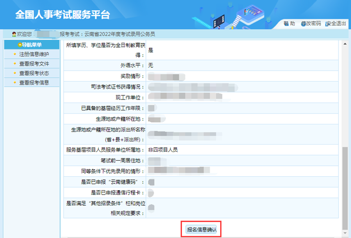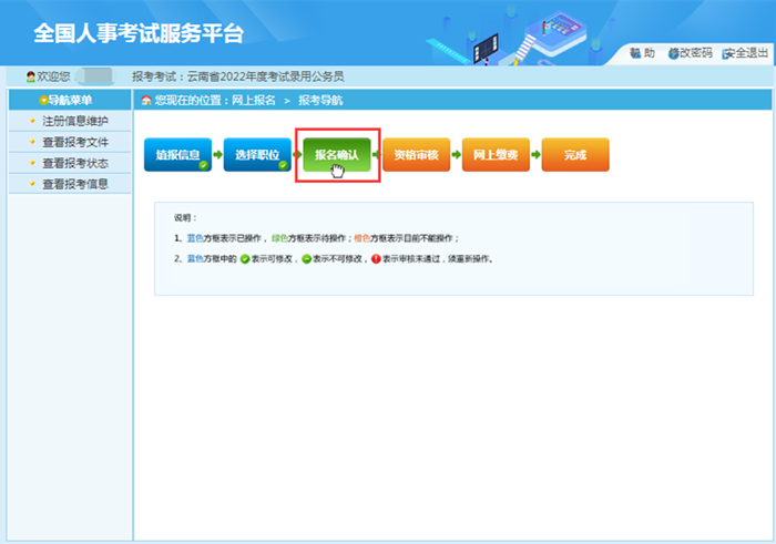 1.只有在“報名信息確認”頁面點擊“確認”按鈕后,才將個人報考信息提交至招考部門,如未完成“報名信息確認”操作,報名過程未全部完成,招考部門將無法看到報考者信息,無法進行資格審查。