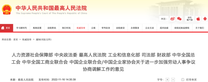 2022年11月16日,最高人民法院與人力資源社會保障部等九部門聯(lián)合印發(fā)《關(guān)于進(jìn)一步加強(qiáng)勞動人事爭議協(xié)商調(diào)解工作的意見》,這是《關(guān)于建立勞動人事爭議“總對總”在線訴調(diào)對接機(jī)制的通知》后,又一重要規(guī)范性文件,對于加強(qiáng)勞動人事爭議源頭治理、協(xié)商和解、多元調(diào)解等工作作出具體部署。