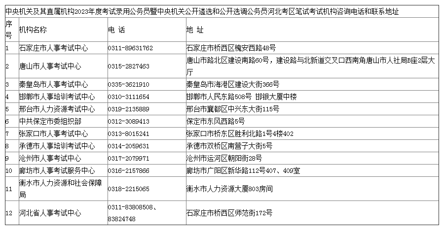 中央機(jī)關(guān)及其直屬機(jī)構(gòu)2023年度考試錄用公務(wù)員暨中央機(jī)關(guān)公開遴選和公開選調(diào)公務(wù)員河北考區(qū)筆試考試機(jī)構(gòu)咨詢電話和聯(lián)系地址