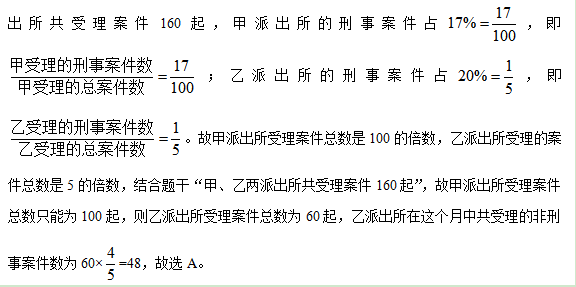 例2:兩個派出所某月內(nèi)共受理案件160起,其中甲派出所受理的案件中有17%是刑事案件,乙派出所受理的案件中有20%是刑事案件,問乙派出所在這個月中共受理多少起非刑事案件?( )