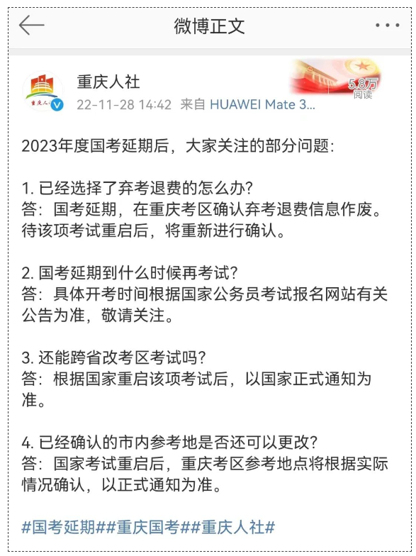 國考延期,暫未知何時重啟,眼下大家有很多關(guān)心的問題,重慶人社第一時間給大家進(jìn)行了解答: