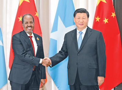 習(xí)近平指出,中方一貫支持索方維護(hù)主權(quán)、尊嚴(yán)和領(lǐng)土完整,長期向非盟駐索馬里特派團(tuán)提供支持,積極推動(dòng)國際社會(huì)支持和幫助索馬里。中方愿同索方維護(hù)政治互信,在涉及彼此核心利益和重大關(guān)切問題上相互理解、相互支持,推動(dòng)中索關(guān)系不斷邁上新臺(tái)階,共同維護(hù)發(fā)展中國家正當(dāng)權(quán)益。中方愿為索馬里重建和經(jīng)濟(jì)社會(huì)發(fā)展提供力所能及的幫助,鼓勵(lì)兩國企業(yè)探討在農(nóng)業(yè)、漁業(yè)、衛(wèi)生等領(lǐng)域合作。中方支持索政府提升維穩(wěn)打恐能力。