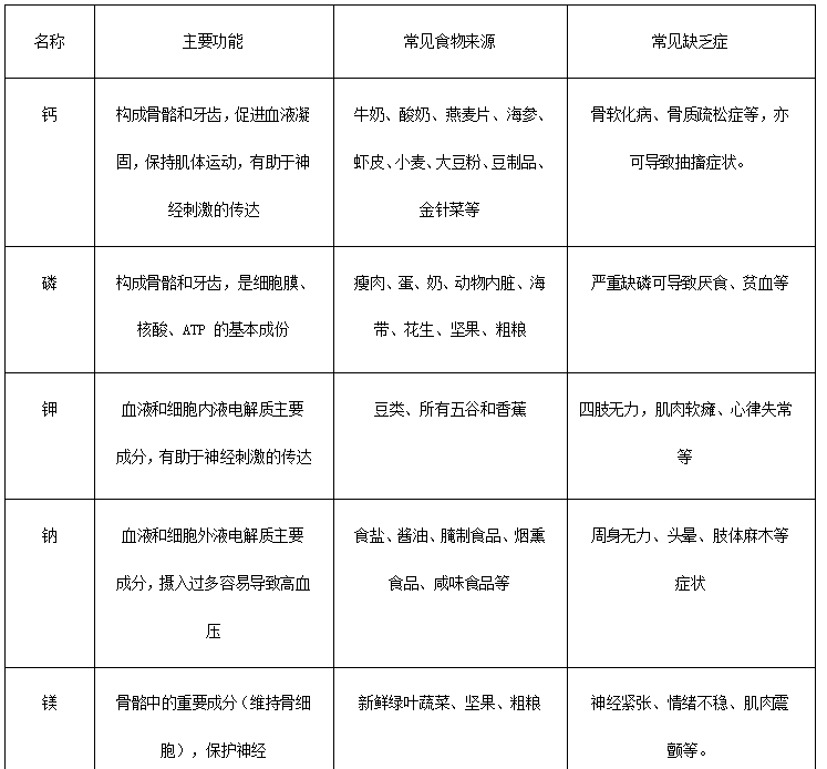 無機(jī)鹽即無機(jī)化合物中的鹽類,過去我們常將其稱為礦物質(zhì)。它在生物細(xì)胞內(nèi)一般只占鮮重的1%到1.5%,在人體中已經(jīng)發(fā)現(xiàn)20余種,其中常量元素有鈣Ca、磷P、鉀K、硫S、鈉Na、氯Cl、鎂Mg(也稱大量元素),微量元素有鐵Fe、鋅Zn、硒Se、鉬Mo、氟F、鉻Cr、鈷Co、碘I等。雖然無機(jī)鹽在細(xì)胞、人體中的含量很低,但是它是構(gòu)成機(jī)體的重要成分,能夠起到維持機(jī)體的酸堿平衡、維持體液的滲透壓、維持神經(jīng)和肌肉的正常功能等作用。因此我們將無機(jī)鹽稱之為人體所需六大營養(yǎng)物質(zhì)之一。
