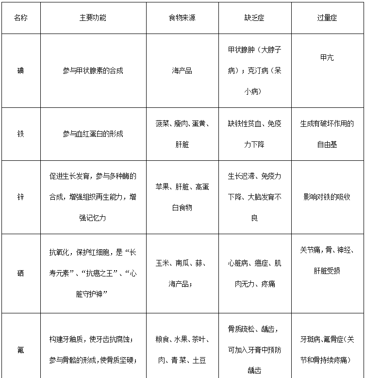 微量元素指人體內(nèi)含量介于體重0.01%~0.005%的元素,人體所需的微量元素有:碘I、鐵Fe、鋅Zn、硒Se、氟F、鉻Cr、銅Cu、錳Mn、鉬Mo、鈷Co。常見微量元素如下表所示。