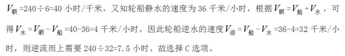 【例題1】A、B兩港相距240千米,一艘輪船從A港出發(fā)順流而下,用了6小時到達(dá)B港。若靜水中輪船的速度為36千米/小時,則這艘輪船從B逆流而上到A港需要多長時間?( )