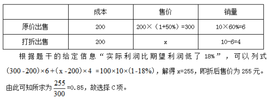 【答案】C【解析】家具店的桌椅分兩批銷售——原價出售和打折出售,結(jié)合銷量以百分?jǐn)?shù)的形式呈現(xiàn),可特值桌椅的數(shù)量總量為10,梳理題意列表如下: