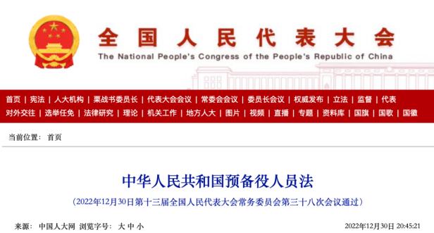 十三屆全國(guó)人大常委會(huì)第三十八次會(huì)議表決通過(guò)《中華人民共和國(guó)預(yù)備役人員法》,自2023年3月1日起施行: