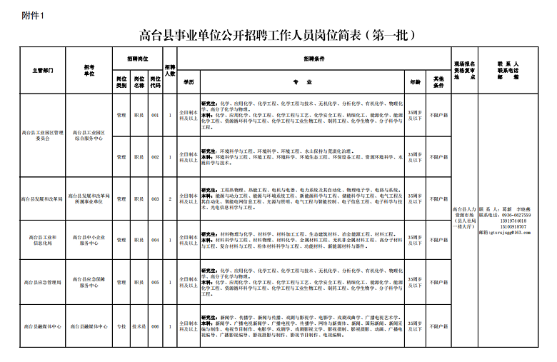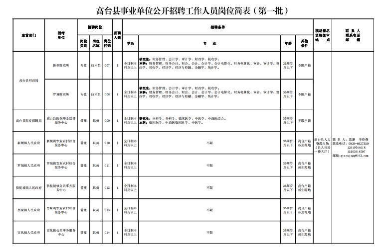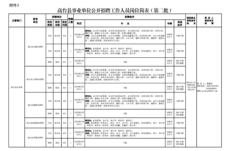 6.具備招聘崗位要求的其他條件,詳見《高臺縣事業(yè)單位公開招聘工作人員崗位簡表》(附件1、附件2,以下簡稱《崗位簡表》)。