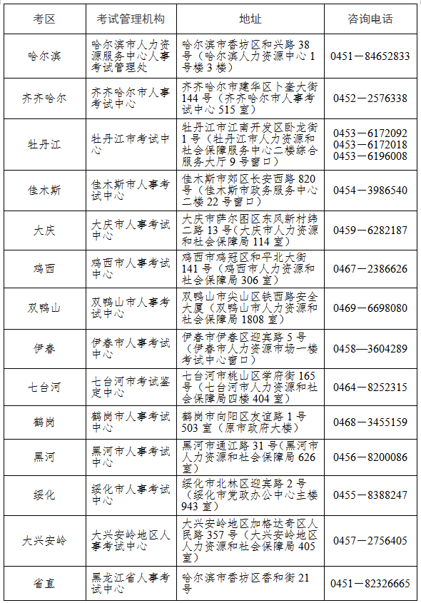報(bào)名時(shí)考生自行選擇筆試考區(qū),并在相應(yīng)考區(qū)參加筆試。省直考區(qū)設(shè)在哈爾濱市,各市(地)考區(qū)設(shè)在各市(地)人民政府所在地。