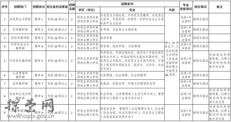 本次面向社會公開招聘專業(yè)技術(shù)人員14名,具體崗位條件詳見《中共重慶市委黨校 重慶行政學(xué)院2023年公開招聘專業(yè)技術(shù)人員崗位情況表》(附件1,以下簡稱《崗位情況表》)。
