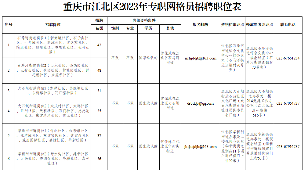詳見《重慶市江北區(qū)2023年專職網(wǎng)格員招聘職位表》。