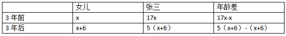 例1:3年前張三的年齡是他女兒的17倍,3年后張三的年齡是他女兒的5倍,那么張三的女兒現(xiàn)在:( )