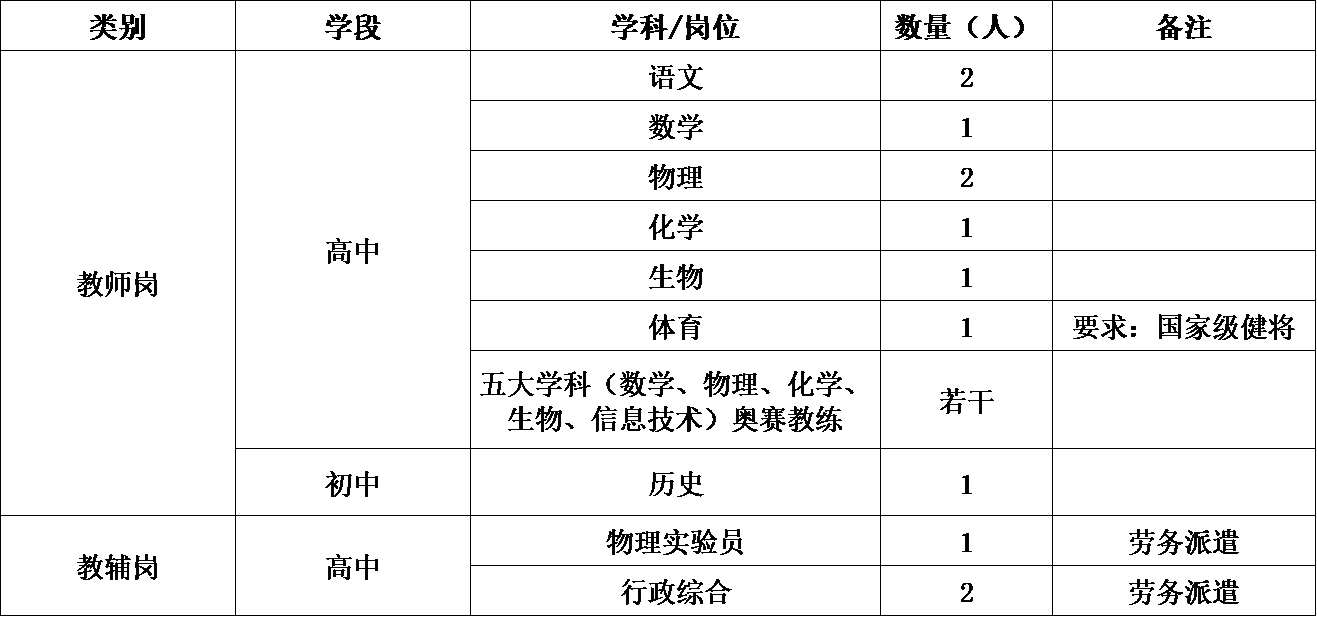 5.除特殊說明外,應(yīng)屆畢業(yè)生需具備碩士及以上學(xué)歷(清華北大本科即可;應(yīng)聘初中教師者,優(yōu)秀的公費(fèi)師范生亦可考慮),在校學(xué)習(xí)成績(jī)優(yōu)秀,有學(xué)生干部經(jīng)歷者優(yōu)先;在職教師需具備碩士及以上學(xué)歷,要求在中學(xué)有三年及以上的任教經(jīng)歷,具備中級(jí)及以上職稱。