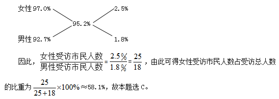【答案】C【解析】97.0%的女性受訪市民表示支持,92.7%的男性市民表示支持,最終95.2%的受訪市民表示支持,則在已知混合前后比重的情況下,根據(jù)口訣三可以得到對應(yīng)的女性受訪市民與男性受訪市民的人數(shù)之比。具體操作如下: