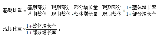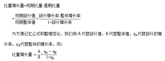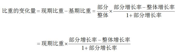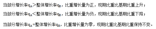 已知比重的部分值和整體值均為正數(shù),則比重增長與否,即上升或下降取決于乘式右邊的分?jǐn)?shù)是正是負(fù),而一般情況下部分增長率不會超過-100%,因此列式的是正是負(fù)取決于“部分增長率-整體增長率”,