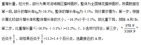 【答案】A【解析】題干為“比重比上年上升/下降……個(gè)百分點(diǎn)”即所求為比重增長量,經(jīng)分析,部分為新疆棉花產(chǎn)量,整體為全國棉花產(chǎn)量,所需數(shù)據(jù)在第二段為部分的