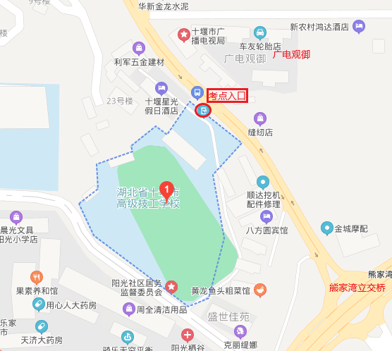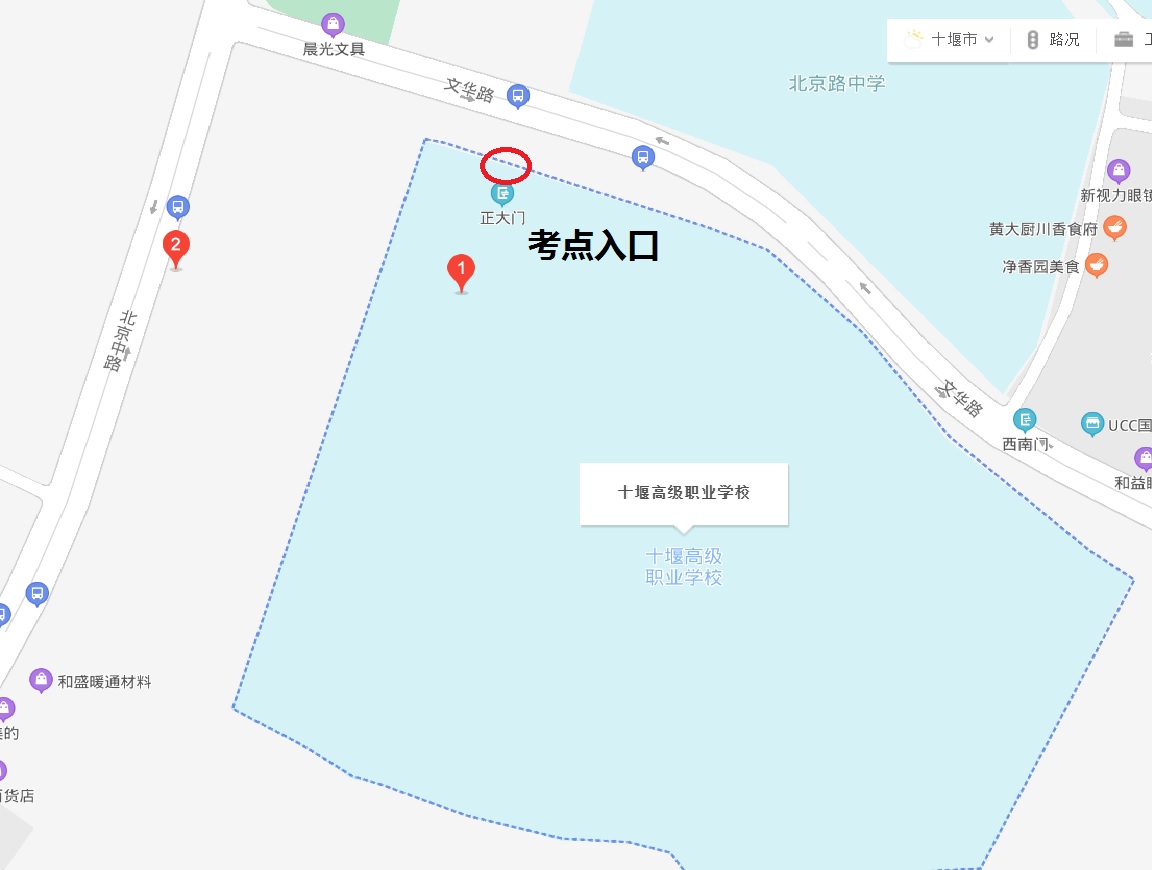 考點入口:文華路十堰高級職業(yè)學校門口(十堰北京路中學正對面);