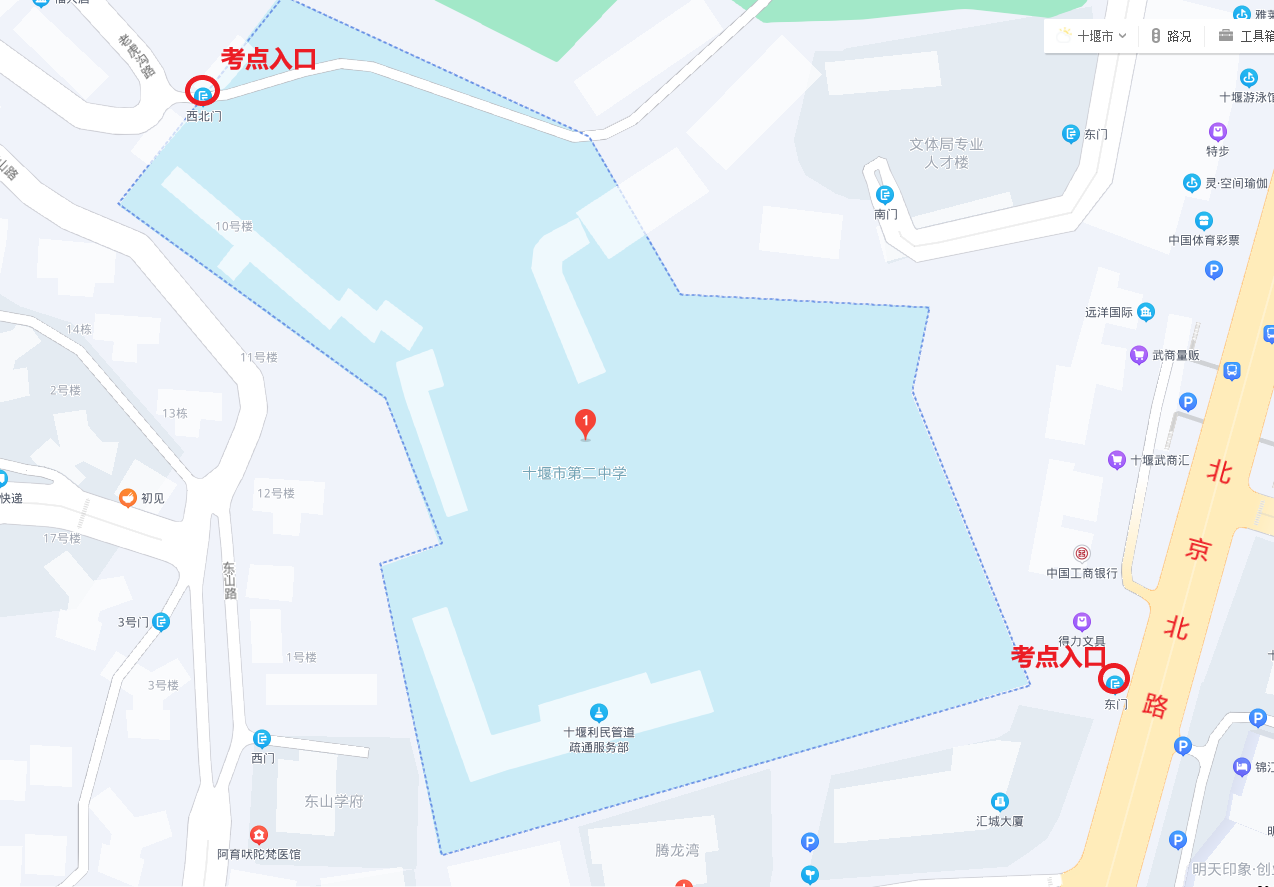 考點入口:北京北路十堰市第二中學(東門)(北京北路,十堰市教育局對面)和十堰市第二中學(西北門)(老虎溝)。