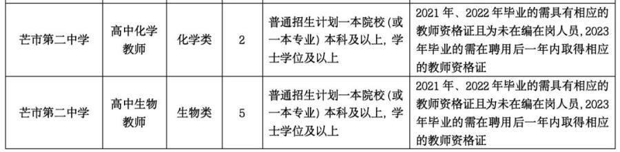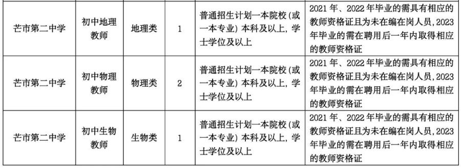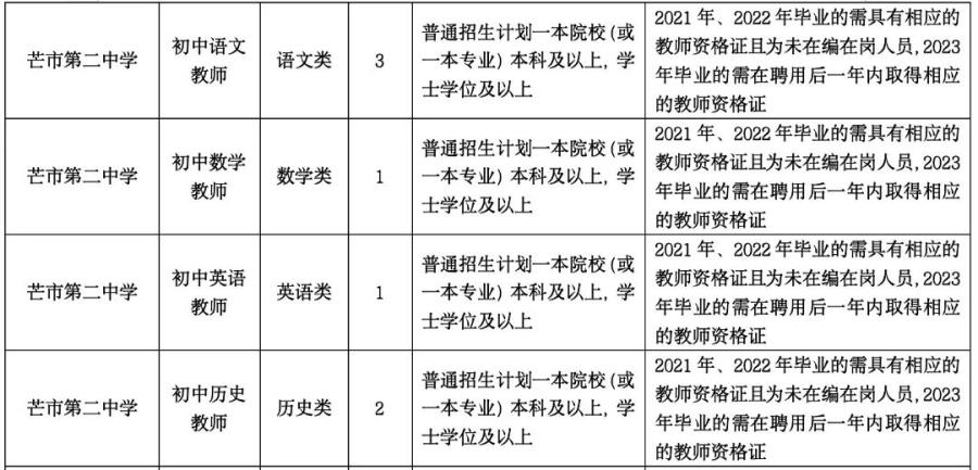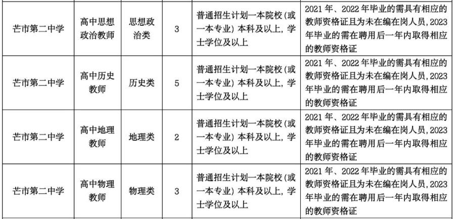 2.2021年、2022年、2023年畢業(yè),所學(xué)專業(yè)與招聘教學(xué)崗位要求相符,普通招生計劃一本院校(或一本專業(yè))學(xué)士學(xué)位及以上學(xué)歷優(yōu)秀畢業(yè)生(未在編在崗,在校期間總體成績優(yōu)異,所學(xué)專業(yè)必修科目無掛科,2021年、2022年畢業(yè)的需具有相應(yīng)的教師資格證,2023年畢業(yè)的需在聘用后一年內(nèi)取得相應(yīng)的教師資格證,未取得的解除聘用合同)。