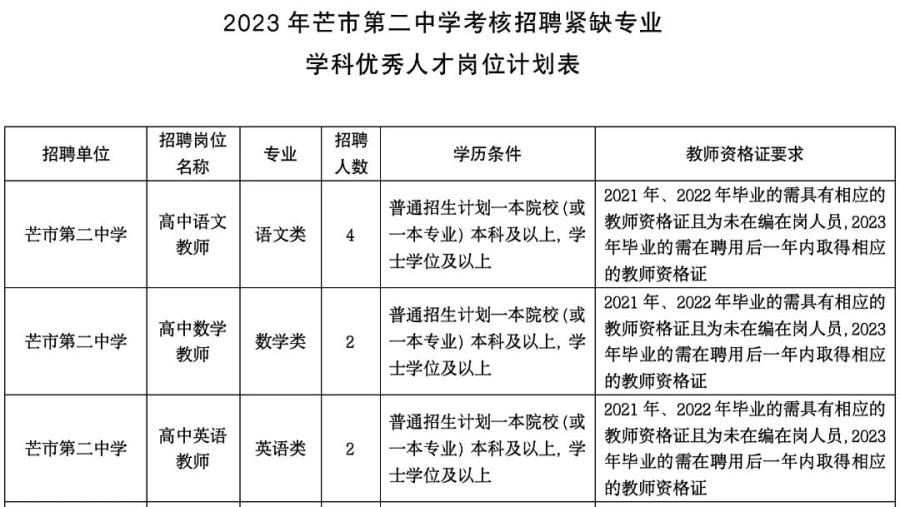 3.具體崗位條件詳見《2023年芒市第二中學(xué)考核招聘緊缺專業(yè)學(xué)科優(yōu)秀人才崗位計劃表》。