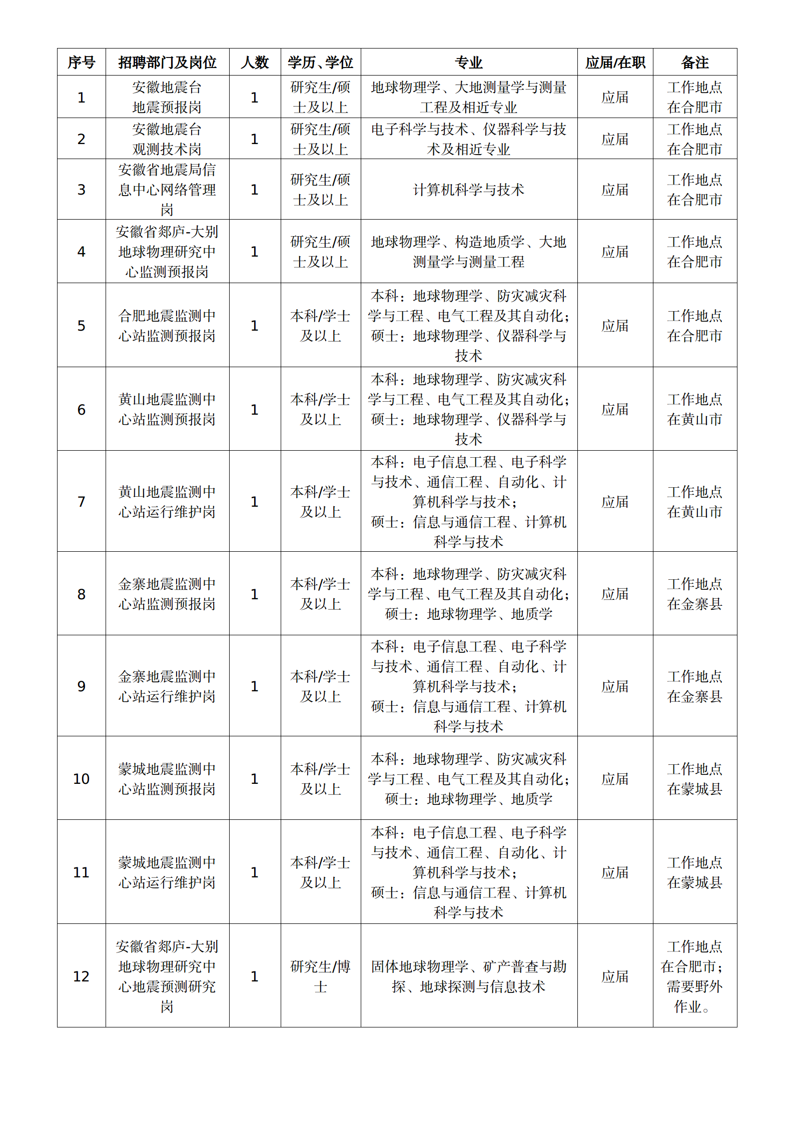 為滿足事業(yè)單位補充工作人員需要,根據(jù)《事業(yè)單位人事管理條例》《事業(yè)單位公開招聘人員暫行規(guī)定》和《中國地震局進(jìn)人管理辦法》等有關(guān)規(guī)定,經(jīng)中國地震局批準(zhǔn),安徽省地震局面向社會公開招聘事業(yè)單位工作人員?,F(xiàn)將有關(guān)事項公告如下。