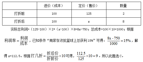 【答案】C【解析】觀(guān)察條件,發(fā)現(xiàn)已知條件均為相對(duì)數(shù),所求仍為相對(duì)數(shù),符合特值法應(yīng)用條件。不妨假設(shè)定價(jià)100元,總購(gòu)進(jìn)數(shù)量為10個(gè)。打折后促銷(xiāo)價(jià)為x元。