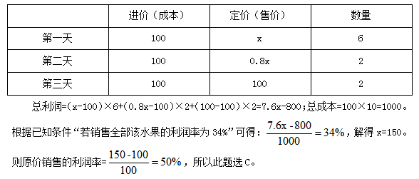 例2:超市銷(xiāo)售某種水果,第一天按原價(jià)售出總量的60%,第二天原價(jià)打八折售出剩下的一半,第三天按成本價(jià)全部售出。若銷(xiāo)售全部該水果的利潤(rùn)率為34%,則該水果按原價(jià)銷(xiāo)售的利潤(rùn)率為:( )