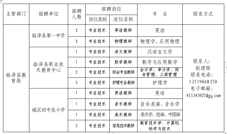 城區(qū)中小學(xué)公開引進(jìn)專業(yè)教師15名,其中:臨澤縣第一中學(xué)4名,臨澤縣職業(yè)技術(shù)教育中心6名(其中文化課2名,專業(yè)課4名),城區(qū)初中及小學(xué)5名。