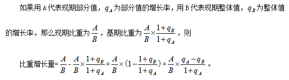 比重增長(zhǎng)量的本質(zhì)是現(xiàn)期比重和基期比重之間的增長(zhǎng)量,故比重增長(zhǎng)量=現(xiàn)期比重-基期比重,而現(xiàn)期比重和基期比重又有各自的公式,如果每次都這樣層層計(jì)算,比較繁瑣。考慮到考察頻率較高,我們不妨將其進(jìn)行化簡(jiǎn),利用化簡(jiǎn)后的形式計(jì)算,也許能減少不少計(jì)算量。