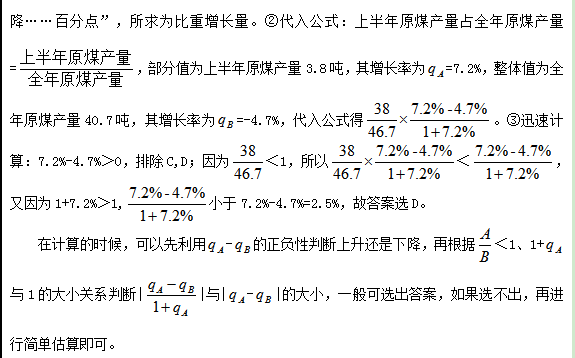 已知部分值、整體值及兩者的增長(zhǎng)率,計(jì)算比重增長(zhǎng)量,計(jì)算時(shí)可結(jié)合選項(xiàng)特點(diǎn)先通過(guò)部分增長(zhǎng)率和整體增長(zhǎng)率的大小判斷比重增長(zhǎng)量的正負(fù),再計(jì)算部分增長(zhǎng)率-整體增長(zhǎng)率的結(jié)果,實(shí)際結(jié)果應(yīng)小于計(jì)算結(jié)果,部分題目可以直接鎖定答案。當(dāng)根據(jù)選項(xiàng)不能直接鎖定答案時(shí),可簡(jiǎn)單估算選答案。