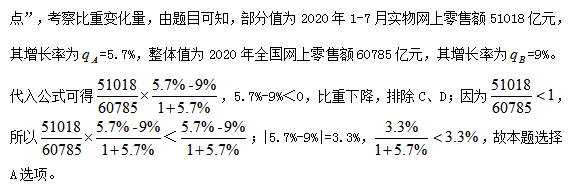 由于部分增長(zhǎng)率為14.1%,整體增長(zhǎng)率為1.9%,部分增長(zhǎng)率大于整體增長(zhǎng)率,則比重上升,排除B、D;再計(jì)算部分增長(zhǎng)率-整體增長(zhǎng)率,即14.1%-1.9%=12.2個(gè)百分點(diǎn),A、C都小于12.2個(gè)百分點(diǎn),