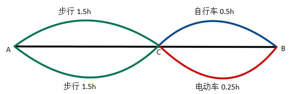 小明的步行速度為1米/秒,從A到B地步行需要3小時,騎自行車需要1小時,電動車的速度是自行車速度的兩倍,現(xiàn)在小明從A地出發(fā),步行1.5小時后騎自行車到B地,然后返回途中先騎電動車走完一半路程,再步行返回A地,則小明往返A、B兩地共用多少小時?( )